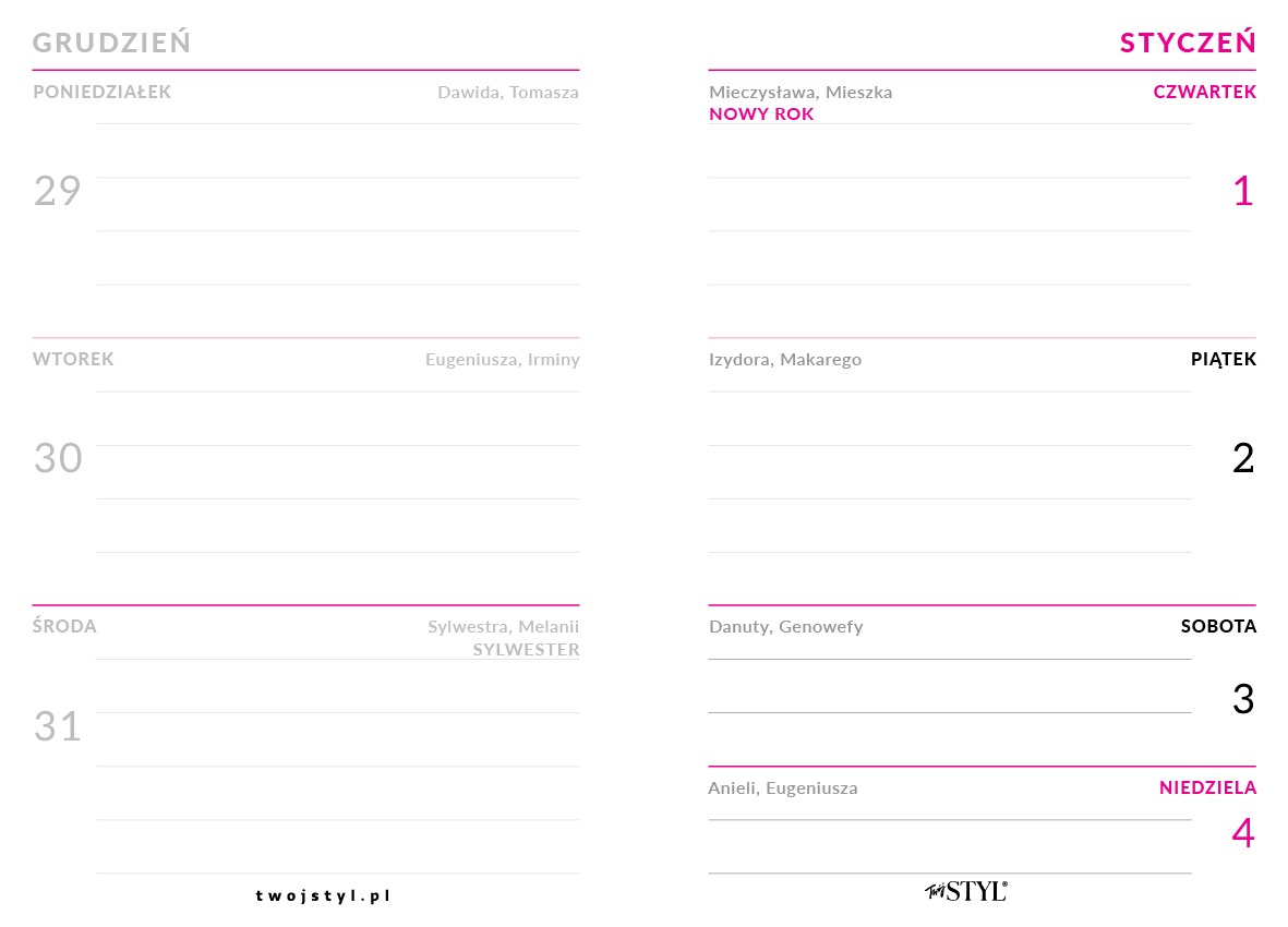 Nowe wyzwania, plany podróżnicze, interesujące spotkania, ważne daty czy czas dla siebie. To wszystko już można planować na nowy rok. Kalendarzyk Twojego STYLU jak zawsze elegancki, przejrzysty i co najważniejsze, nie zajmuje wiele miejsca. Występuje w 2 wariantach kolorystycznych okładki.*