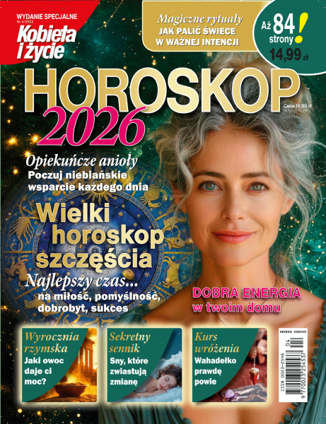 Przed nami kolejny rok! Drogie Czytelniczki, już po raz kolejny oddajemy w Wasze ręce Kobieta i Życie Wydanie Specjalne poświęcone horoskopom. A w środku m.in. „Wielki Horoskop Szczęścia”, przepowiadający które miesiące w roku będą sprzyjać miłości, dobrej formie i sukcesom w pracy, „Dom z dobrą energią”, czyli sposoby na oczyszczenie przestrzeni, stworzenie miejsc mocy oraz talizmany i rytuały dla domu, opiekuńcze anioły na każdy miesiąc roku, horoskop celtycki, sprawdź jakim drzewem jesteś i co to oznacza dla Ciebie oraz wielki sennik podpowiadający, o czym mówią nasze sny, jak je odczytywać i co może Ci pomóc. W numerze znajduje się również poranny rytuał „Powitanie słońca”, który wspaniale pobudza ciało i umysł, kurs wróżenia – co Ci powie wahadełko oraz sztuka chiromancji, czyli co można odczytać z dłoni, a także cygańskie pasjanse, które umilą jesienno-zimowe wieczory oraz numerologia partnerska, która pozwoli sprawdzić, co o tobie mówi twoja liczba.